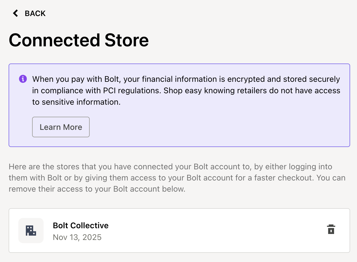 To remove a store’s access to your Bolt account data, go to the Account Settings page. After you remove access, you need to reauthorize the store the next time you check out using Bolt.
